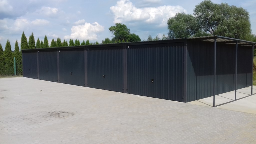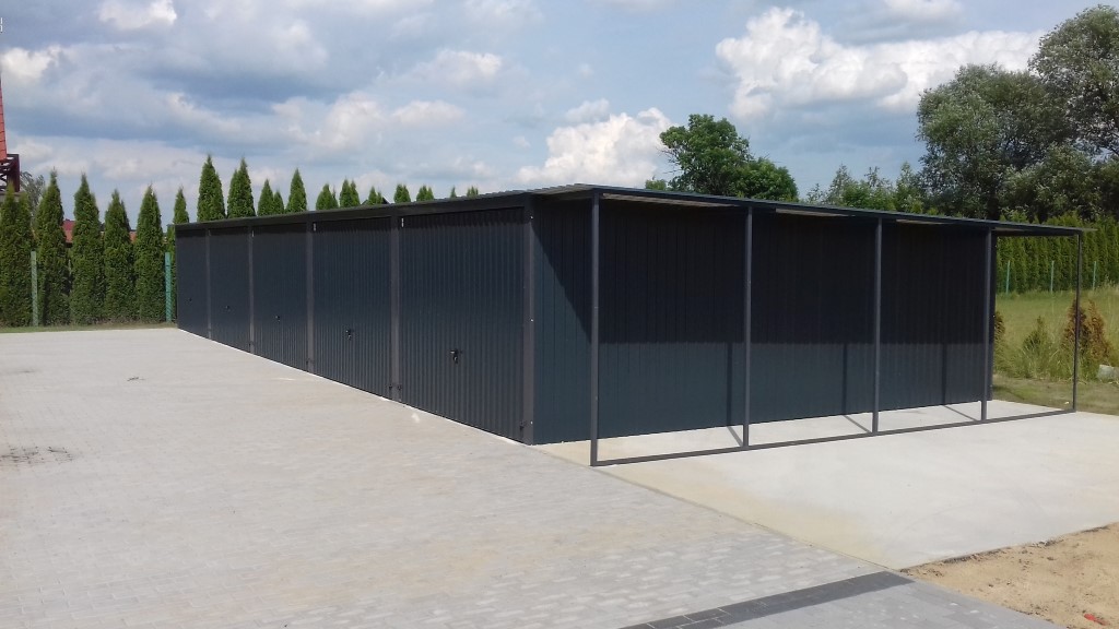 Konstrukcja garażu 15,00 x 6,00 wykonana została z kątowników zimno-giętych malowanych farbą podkładową i nawierzchniową w kolorze grafitowym-RAL7016. Dach ze spadem na tył (2,13m front / 1,90m tył. Całość o wymiarze 15,00m składa się 5 garaży o szerokości 3,00m. Każde stanowisko posiada bramę uchylną wyposażoną w zamek z klamką oraz dwa uchwyty na kłódki. Z prawej strony znajduje się zadaszenie o szerokości 1,00m, którego konstrukcja została wykonana z kształtowników zamkniętych malowanych farbą podkładową i nawierzchniową w kolorze grafitowym-RAL7016. Poszycie stanowi blacha powlekana w kolorze grafitowym-RAL7016. Na ścianach trapez T12, na dachu trapez T18.