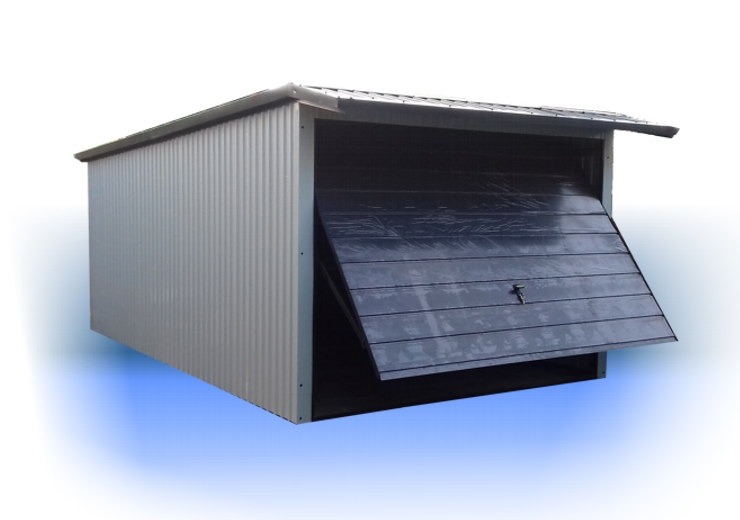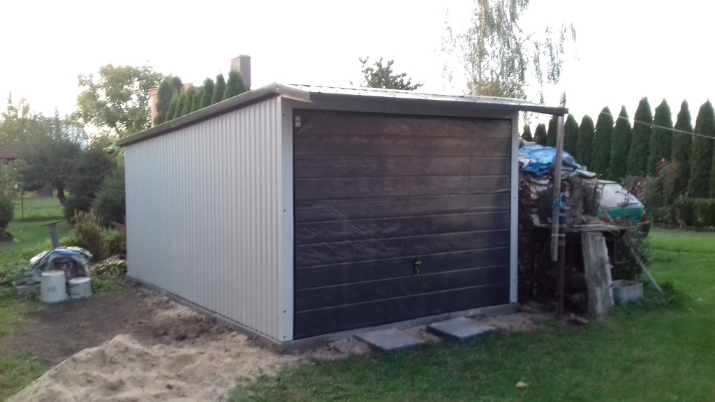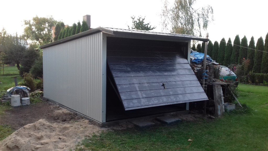 Garaż premium o wymiarach 3,00m szerokości x 5,00m głębokości z dachem spadzistym w kierunku tyłu (2,45m front / 2,20m tył). Konstrukcja wykonana z kształtowników zamkniętych malowanych proszkowo. W garażu zamontowana brama uchylna. Poszycie stanowi powlekana blacha trapezowa: ściany w kolorze szarym-RAL7035; dach opierzenia, brama w kolorze grafitowym-RAL7024. Na ścianach trapez T12, na dachu T18, na bramie T8 wykonany w szerokim przetłoczeniu. Całość posiada opierzenia w postaci narożników, wiatrownic oraz daszka nad bramą.