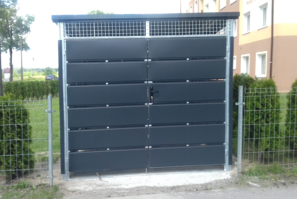 Wiata śmietnikowa panelowa 2×2 m. Konstrukcja wiaty wykonana została z ocynkowanych kształtowników zamkniętych. Szerokość oraz głębokość wiaty panelowej wynosi 2,00 m. Dach ze spadem na tył (2,30m front / 2,10m tył) poszyty powlekaną blachą trapezową T18,kolor grafit-RAL7016. Przestrzeń między dachem, a górnym panelem wypełniona siatką. Poszycie ścian i bramy stanowią panele wykonane z blachy o grubości 0,7mm w kolorze grafitowym-RAL7016. Wiata śmietnikowa panelowa 2×2 m posiada obróbki w postaci narożników oraz wiatrownic w kolorze grafitowym-RAL7016.